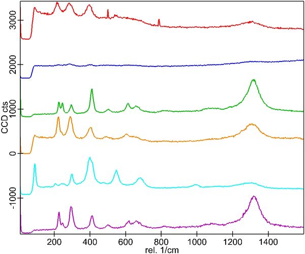 Las diferencias en los espectros de la hematita se atribuyen a las diferentes orientaciones de los cristales (espectro Raman, derecha: la hematita es roja, azul, verde, naranja y rosa; la goethita es azul claro).