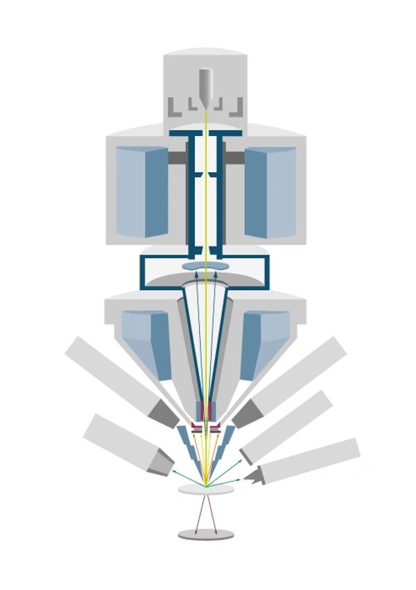 Consiga un análisis completo y sin sombras en su FE-SEM. Benefíciese del uso de una corta distancia de trabajo analítico de 8,5 mm y de un ángulo de despegue de 35°.