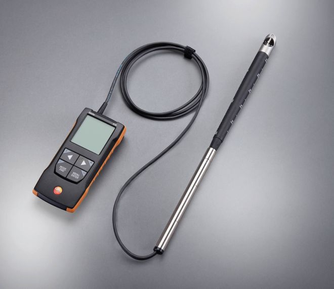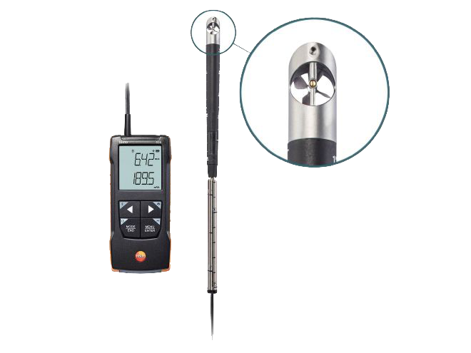 El compacto anemómetro de molinete de 16 mm testo 416 con sonda telescópica y conexión a la App es ideal para un cálculo sencillo, rápido y preciso de la velocidad de flujo y el caudal en conductos de ventilación de sistemas de ventilación y de climatización. La conexión a la App testo Smart permite la configuración, la visualización (incluso como segunda pantalla) y el almacenamiento, así como la documentación de los valores medidos directamente en la App.