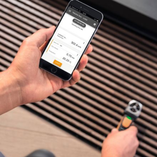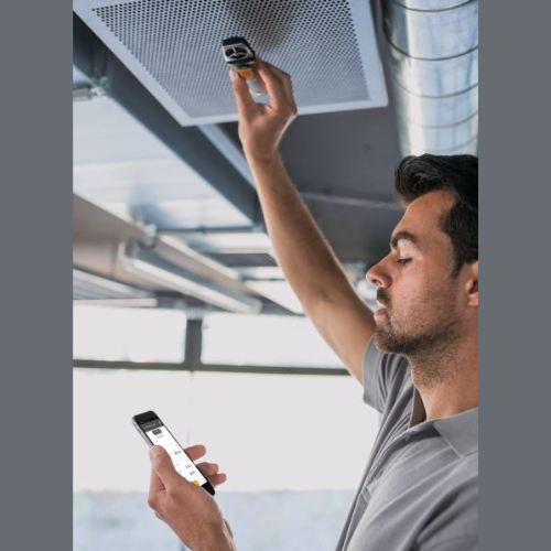 Tecnología de medición profesional en formato pequeño: el compacto anemómetro de molinete testo 410i con manejo a través de teléfono inteligente mide rápida y fiablemente el caudal volumétrico, la velocidad del aire y la temperatura en la salida de aire. La aplicación testo Smart brinda una lectura cómoda de los valores medidos, así como funciones adicionales inteligentes.