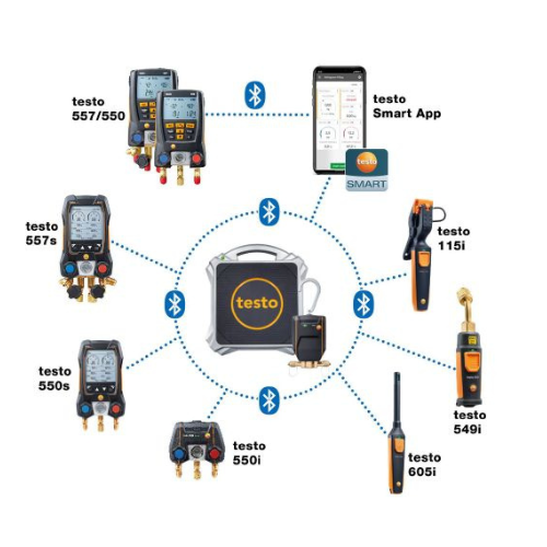 Compatible con los analizadores digitales de refrigeración testo 557s/550s/550i, así como los testo 557/550, las Smart Probes testo 115i/549i/605i, la App testo Smart para Android y iOS
