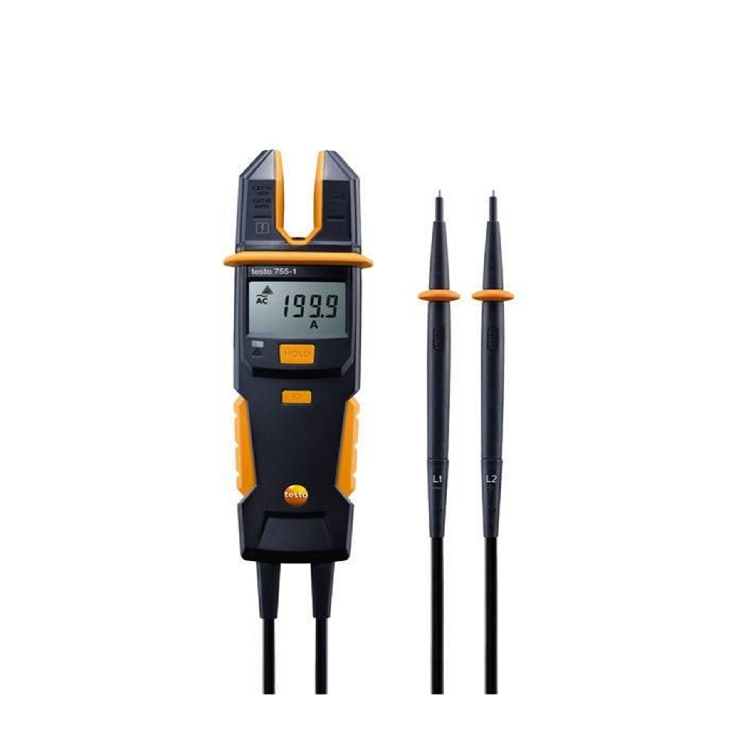 Detector de tensión y corriente testo 755-1 incl. pilas, puntas de medición, y piezas adicionales para las puntas de medición, protocolo de calibración y manual de instrucciones.