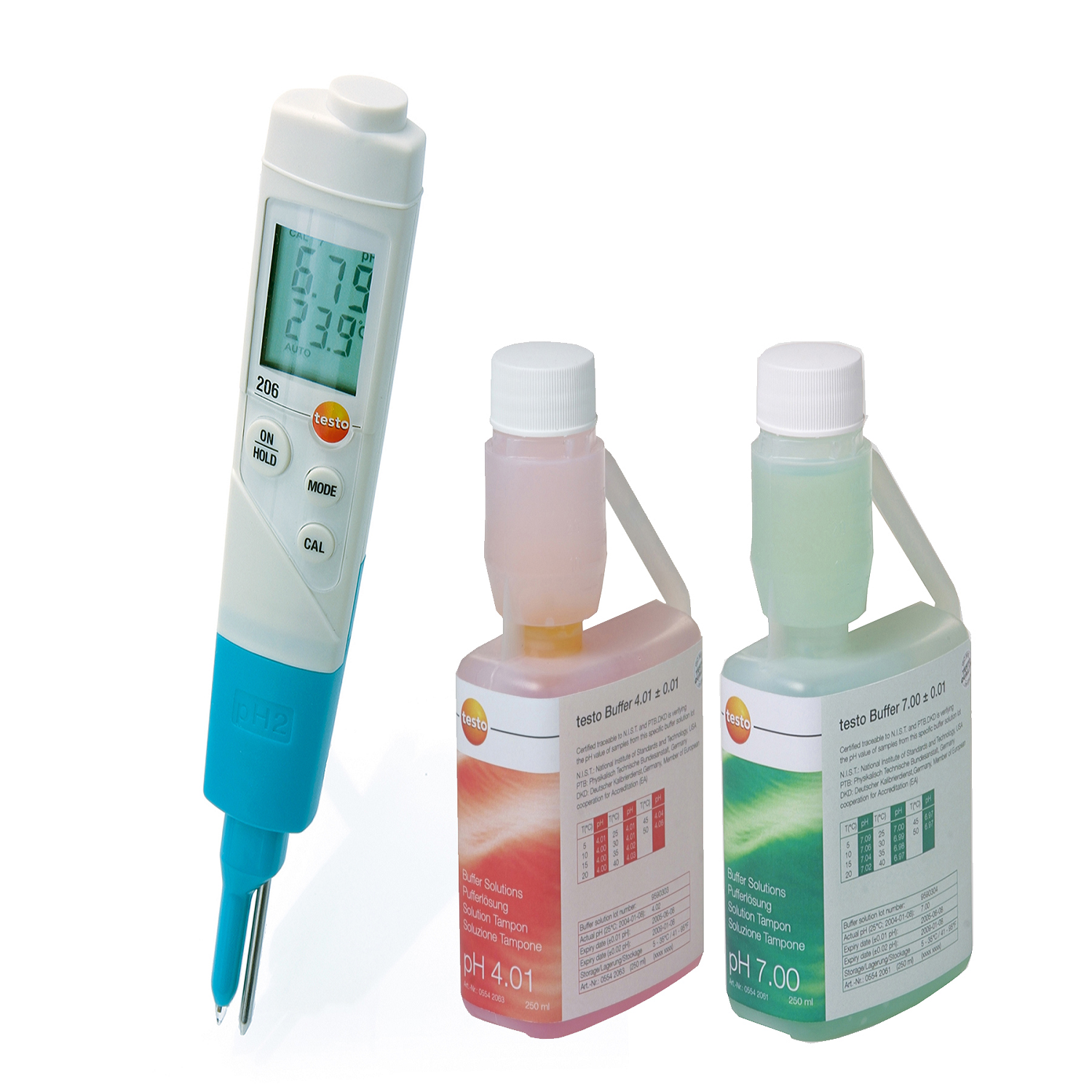 • Medidor de pH/temperatura testo 206-pH1 con sonda de pH1 para medios líquidos • Tapón de almacenamiento con gel • 2 botellas dosificadoras para la solución de calibración de 250 ml con valor pH 4.01 y 7 • Funda protectora TopSafe • Soporte de cinturón/pared • Maletín de aluminio