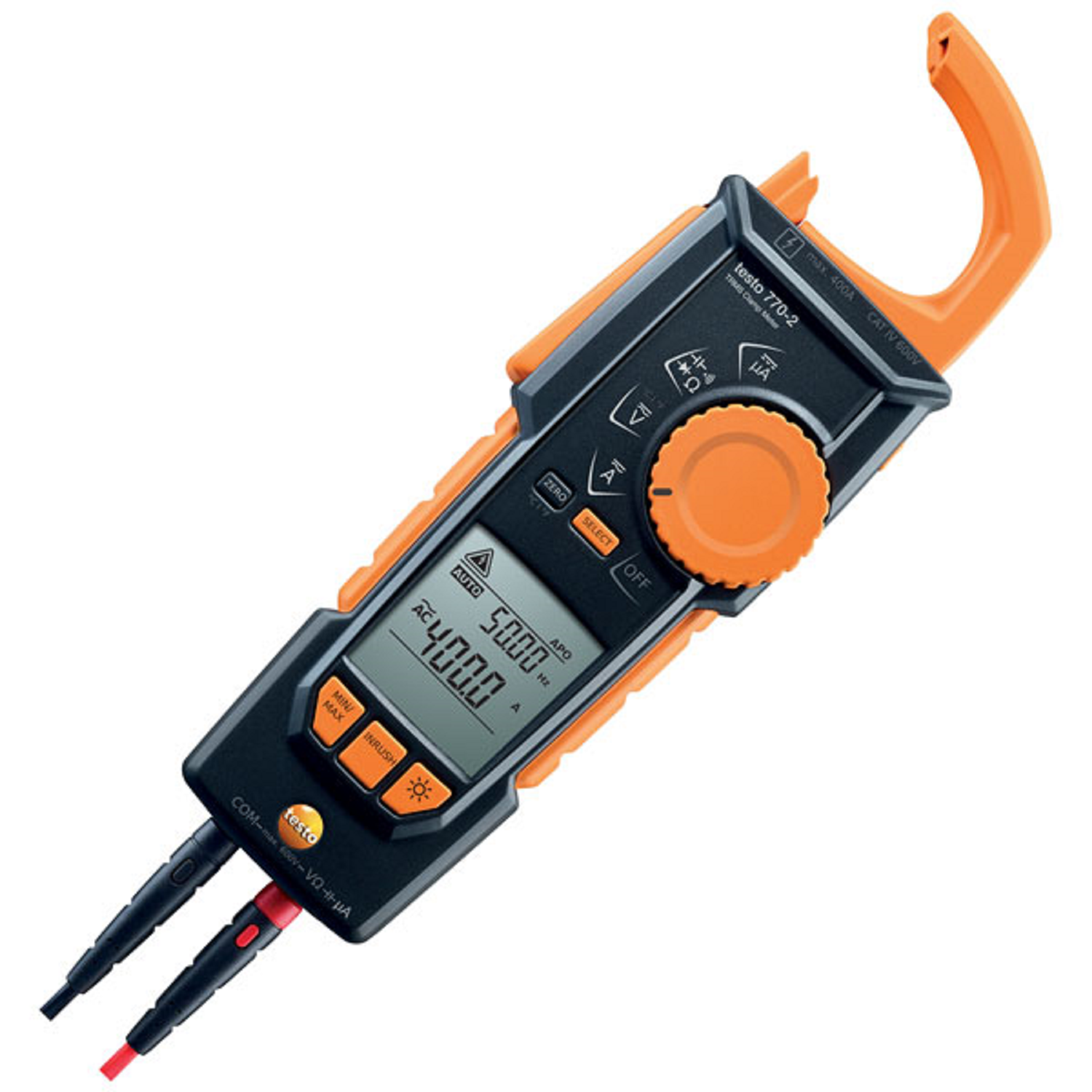Pinzas amperimétricas TRMS testo 770-2 incl. pilas, 1 juego de cables de medición (0590 0010), 1 adaptador para termopares tipo K, manual de instrucciones.