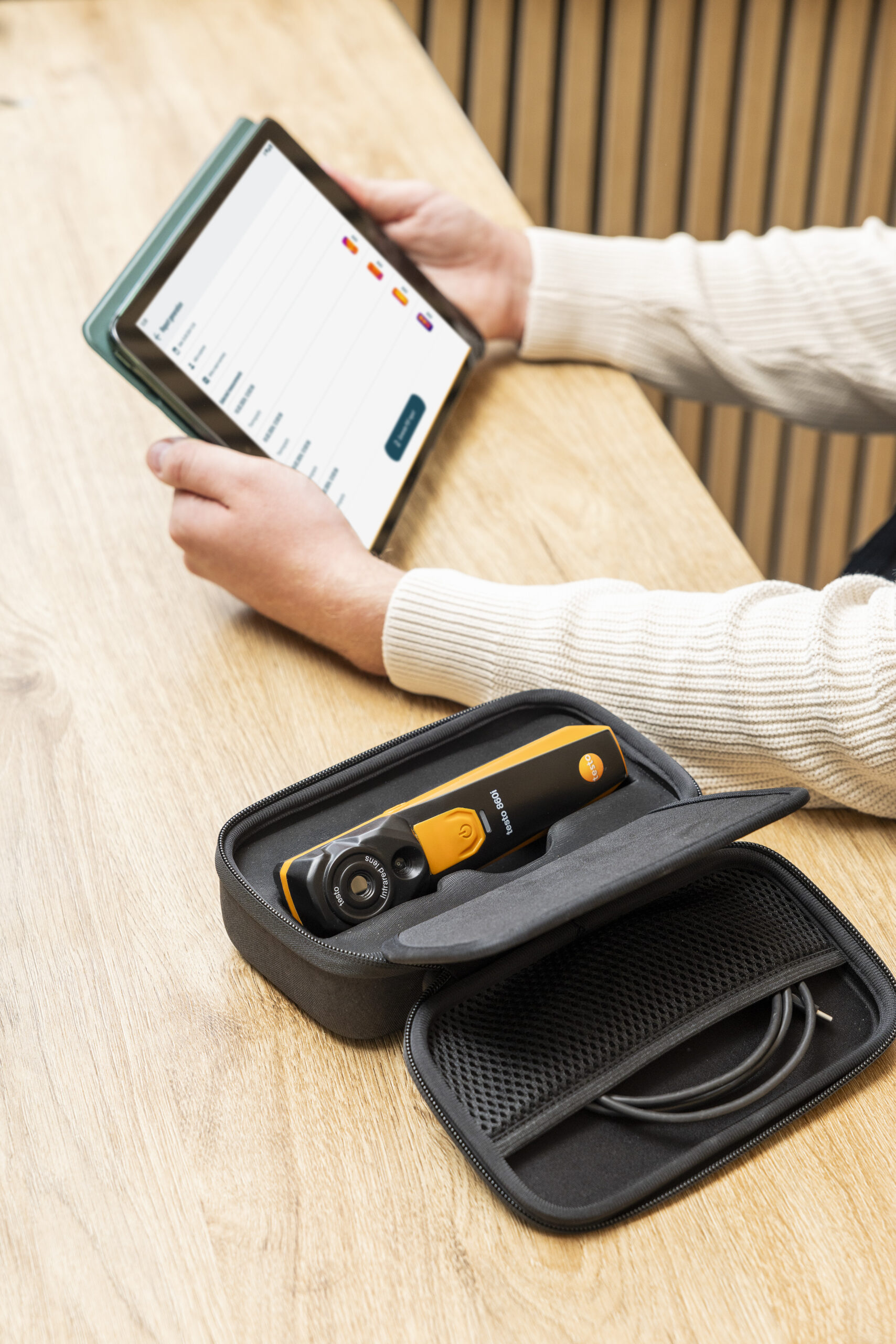 Toda la configuración, el manejo, la visualización de termografías y la elaboración de informes se hace con la App testo Smart. La testo 860i puede utilizarse tanto como instrumento portátil o acoplada con los clips al smartphone o la tablet. Es una cámara muy útil para las mediciones diarias gracias su batería recargable, su protección IP54 y su protección contra caídas hasta un máximo de metro y medio.
