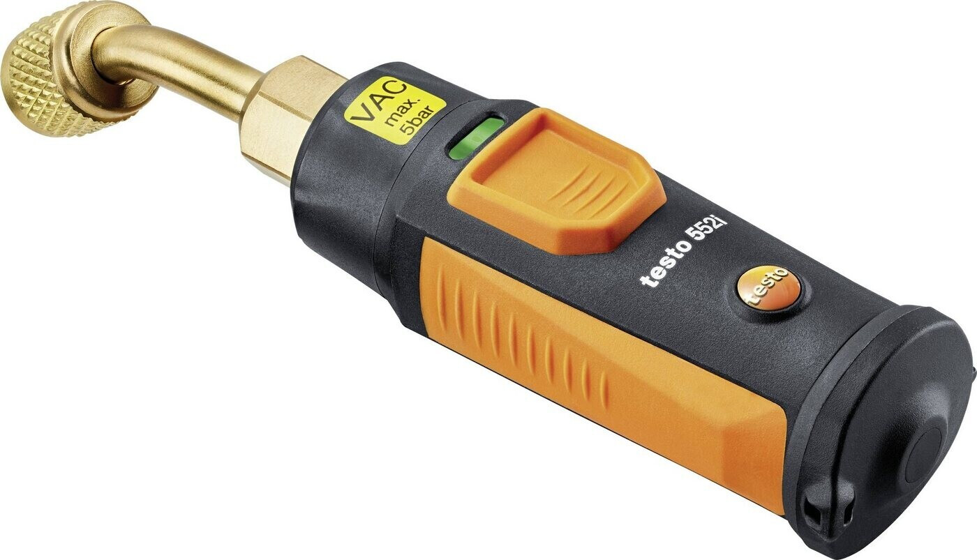 Con la sonda de vacío testo 552i incl. Bluetooth es posible medir el vacío de forma inalámbrica, rápida, fácil y precisa a través de solo una conexión de servicio, sin pérdida de refrigerante. La App testo Smart le colabora con diversas funciones inteligentes. Estas reconocen inmediatamente, por ejemplo, el vacío a través de la representación gráfica en la App o en la pantalla del analizador de refrigeración. Gracias a su robusta y práctica carcasa y la tecnología de medición probada, la sonda de vacío es compacta y fiable para la medición de vacío en sistemas de frío y climatización así como en bombas de calor.