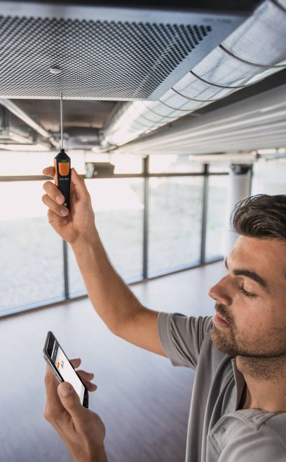 El termómetro compacto profesional testo 905i es ideal en combinación con un teléfono inteligente o tableta para la medición de temperaturas ambiente, así como temperaturas en canales y salidas de aire.