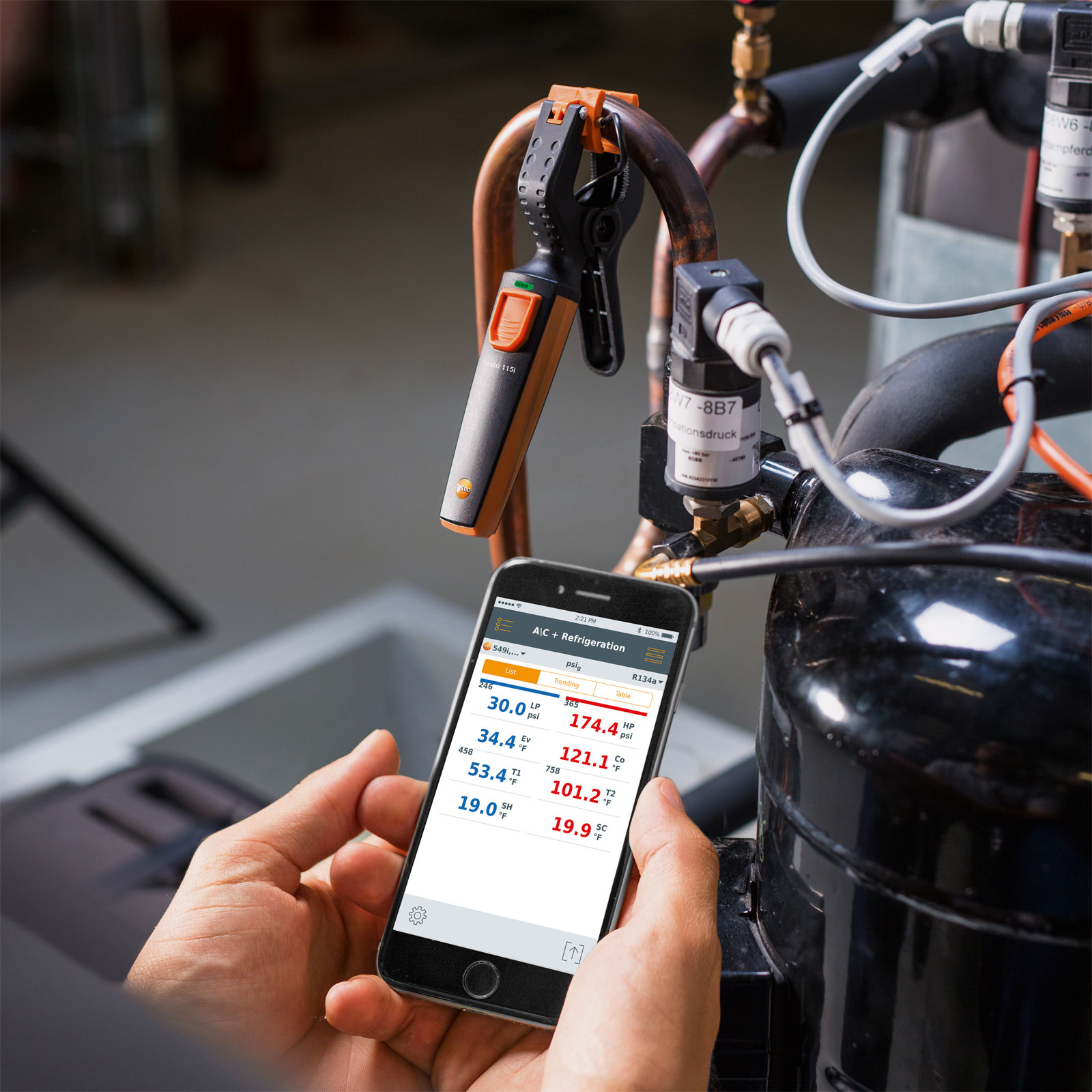 La tecnología de medición profesional nunca antes había estado tan móvil: especialmente para las mediciones de temperatura en puntos de medición que están a mucha distancia entre sí, el testo 115i facilita la aplicación considerablemente gracias a la conexión inalámbrica con el teléfono inteligente o tableta. Y para la aplicación conjunta con el manómetro testo 549i también es posible calcular los distintos parámetros de los sistemas de refrigeración.