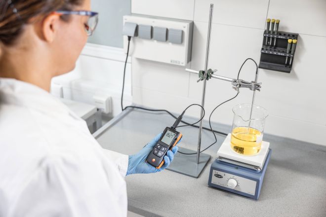Fácil de manejar y precisión en la medición: Así convence el termómetro compacto testo 110 todos los días en durante su uso. Especialmente durante el uso en laboratorios o en el entorno alimentario, este rápido todoterreno de la temperatura saca a relucir sus cualidades: Las sondas NTC o Pt100 disponibles opcionalmente abarcan una amplia gama de tareas de medición y garantizan resultados precisos gracias a su elevada exactitud. Además, las sondas Pt100 pueden calibrarse sin el analizador. De este modo es posible continuar trabajando simplemente con otras sondas sin tiempos de inactividad. Naturalmente, el testo 110 es conforme a APPCC, está certificado según la norma EN13485 y gracias a la funda de protección opcional TopSafe es hermético y está protegido contra salpicaduras (tipo de protección IP65). El termómetro se complementa con la App testo Smart para smartphones y tablets: